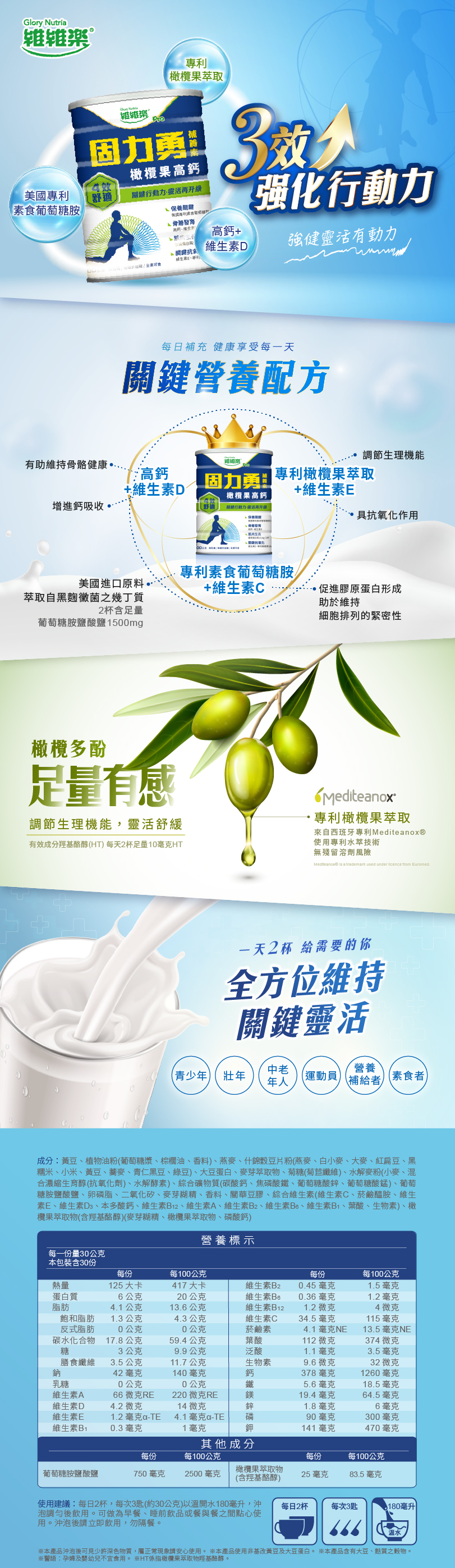 黃豆、植物油粉、燕麥、什錦穀豆片粉、大豆蛋白、麥芽萃取物、菊糖(菊苣纖維)、水解麥粉、綜合礦物質、葡萄糖胺鹽酸鹽、卵磷脂、二氧化矽、麥芽糊精、香料、關華豆膠、綜合維生素、橄欖果萃取物(含羥基酪醇)